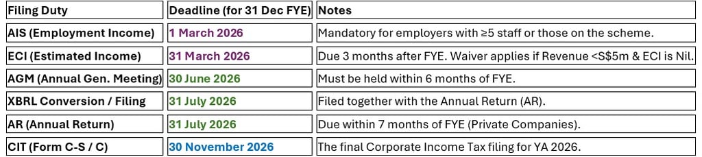 Assuming a standard 31 Dec 2025 FYE for these companies, here are the critical dates for the 2026 filing season: